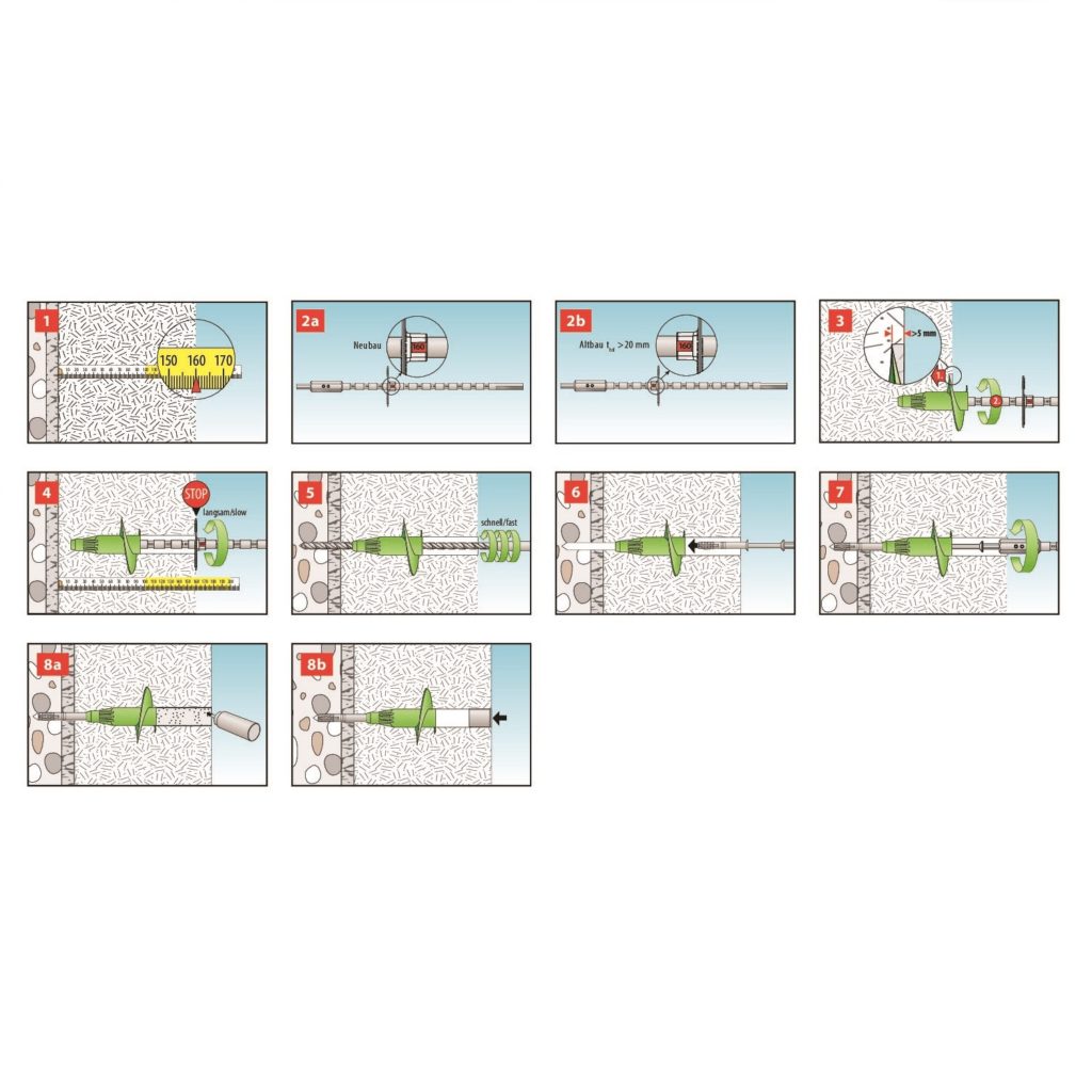 - Für alle Materialien (Beton, Vollziegel, Lochsteine, Vollsteine poriges Gefüge, Lochsteine, poriges Gefüge) und Dämmung